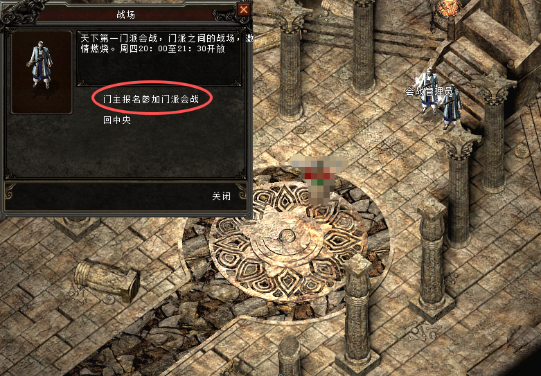 2、报名:每周四12:00-19:00,(门主报名)门派门主从中央市场武林盟主雕像进入门派备战区,找到会战管理员NPC进行报名。